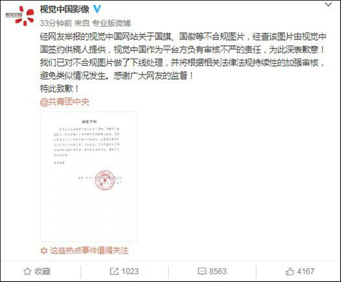 今天凌晨,视觉中国再次发文致歉,表示愿意接受广大网友和媒体的监督批评,会全面配合监督部门彻底积极整改。就网友举报的关于国旗、国徽等不合规图片的问题,视觉中国深表歉意。目前,公司已采取措施对不合规图片全部下线处理,并根据相关法律法规自愿关闭网站开展整改,进一步强化企业自律,强化制度建设,提升内容审核的质量,避免类似情况再次发生,公司还表示会取教训认真整改。